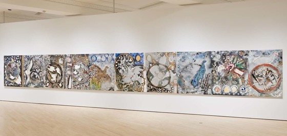 Canadian painter and sculptor Jean-Paul Riopelle (7 October 1923 – 12 March 2002) was born in Montreal and turned to surrealism in his early twenties. He moved to Paris after the war and had there his first solo exhibition in 1949. Within a short time he had moved on from surrealism to lyrical abstraction. For twenty years beginning in 1959 he had a relationship, artistic and romantic, with the American abstract expressionist Joan Mitchell. The large sheet from the year 2003 offers sections of his L’Hommage à Rosa Luxemburg (1992), painted in tribute to Mitchell after her death. The piece, acrylic and spray paint on canvas, is in three “segments” (here is the second in situ at the Musée national des beaux-arts du Québec), each of which is subdivided into connected panels. The stamp sheet presents, from top to bottom, two stamps from each of the segments.
