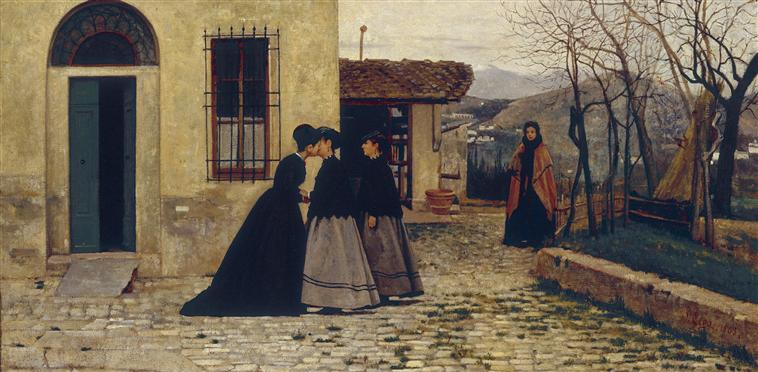 Italian realist painter Silvestro Lega (8 December 1826 – 21 September 1895) was also active in the revolutionary movement of 1848, joining Garibaldi in the bid for Italian independence. He had studied painting in the years leading up to that momentous struggle, but didn’t paint his first large scale canvas, a Doubting Thomas, until 1850. His most representative works, though, would be genre pictures. The stamp gives us a look at his canvas The Visit (1868). Lega’s middle years were clouded by the deaths of his lover Virginia Batelli and three of his brothers, as well as by financial troubles. Toward the end he lost most of his eyesight. I like his charming Il canto di uno stornello (The Singing of a Ditty, 1868), which probably portrays members of the Batelli family, with whom Lega resided in his happier years. He never left Italy.