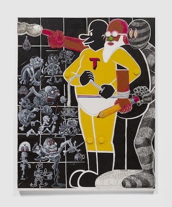 Trenton Doyle Hancock, Step and Screw: The Star of Code Switching, 2020; acrylic, faux fur, graphite, plastic tops, and paper collage on canvas. The Jewish Museum, NY. Purchase: Arts Acquisition Committee Fund