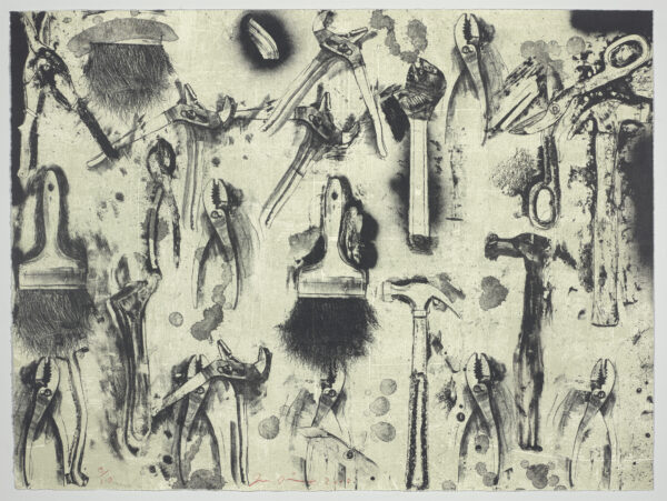 It has been said that every Dine work is a self-portrait. Dine says he hit on the empty bathrobe, a signature image in his paintings though not in these prints, while searching for a way to make self-portraits without including his face. An illustration he saw of a bathrobe suggested his shape, and the garment, rendered in elegant lines, became his stand-in. Similarly, the tools rendered in these prints, especially the ones that suggest an artist’s studio, seem to be objects with which Dine has had a long working relationship, things he has come to see as extensions of himself. Anthropologists note that tools are extensions of the body, prosthetic claws and tentacles, that allow the bare hand to develop skills — pounding a nail, turning a screw, cutting a wire, painting a wall — it could never manage on its own.