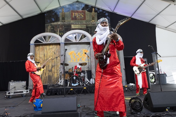 In this case it was a high-pitched racket of guitar and rhythm coming from the Expedia Cultural Exchange Pavilion in the Fair Grounds infield. Inside, two guitarists and a bassist, dressed in desert threads — white Arabic headdresses and floor-length tunics — were bobbing to a heavy beat, unleashing unearthly screams from their instruments, diamond-like glittering cascades of overlapping patterns, super trebly, with a square four-to-the bar rhythm, driven by the hard, flat clatter of snare, bass drum, and splashing cymbals, occasionally accelerated by a vicious single-stroke roll or broken by a quick pattern of quarter-note triplets.