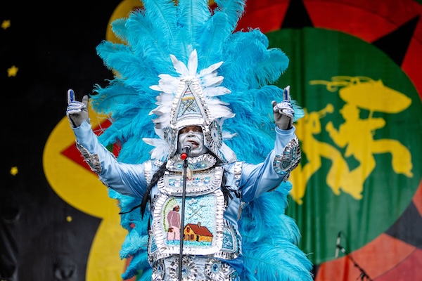 This year that tradition was carried forward by Flagboy Giz, who appeared with the Wild Tchoupitoulas on the big Congo Square stage. Giz, a local producer and MC, joined the Wild Tchoupitoulas as Flagboy in 2015, combining the traditional cadences of the Mardi Gras Indian chants with his own take on the syncopated flow of New Orleans bounce, and addressing topical issues in songs like “We Outside,” with its refrain of “There’s only one Super Sunday, it ain’t the Super Bowl,” a reference to an annual Black Masked Indian confab. Another song slagged gentrification (“There goes the neighborhood when you see the bike lane”). The music was backed by an electric band and horn section, giving the gritty street raps a brassy gleam. But there was plenty of darkness in the light, in songs like Saint Joe (“We tried to kill ’em that night on Saint Joe”), with an especially chilling refrain (“St. Joe!”), delivered high and loud by 9-year-old Spyboy T3.