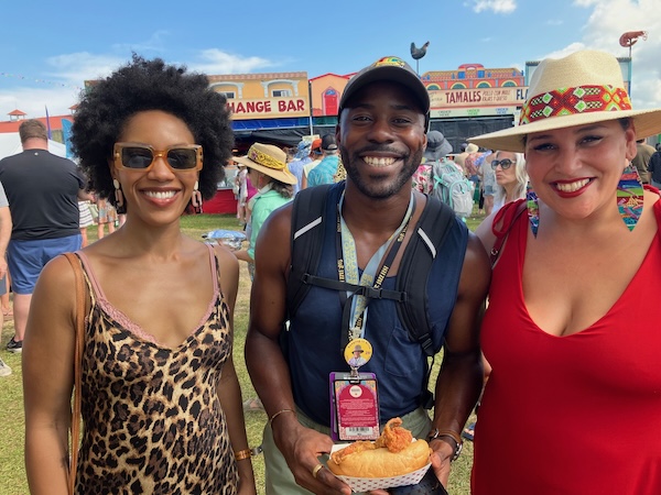 At the Expedia Cultural Exchange Pavilion, left to right: Jessica Gillespie, 39, arts and culture publicist, Chicago; Blake-Anthony Johnson, 34, CEO, Jazz & Heritage Foundation, New Orleans; and Leslé Honore, 49, tech company CEO, Chicago. Had you heard Etran de L’Aïr before? Blake-Anthony: “No. Quint Davis found them. He’s a great producer. He finds artists from all over the world.” Leslé: “I’ve never heard anything like them in my life. That’s what’s great about JazzFest.” Photo: Jon Garelick