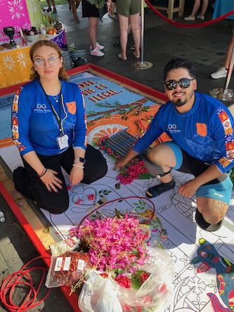 Cultural Exchange Demonstration Tent: Mariana Guzmán, 22, graphic designer, and Jesus Gauiña, 23, artist, Guanajuato, Mexico. They are creating an alformbrista, or carpet, a traditional Mexican street art. The finished alformbrista read, “En este mundo, nadie es ilegal” (“In this world, no one is illegal”). Photo: Jon Garelick