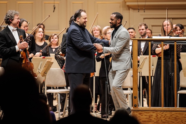 BSO music director Andris Nelsons and Carlos Simon on stage at Symphony Hall, following the BSO’s performance of Four Black American Dances, February 9, 2023. Photo: Aram Boghosian, courtesy of the BSO