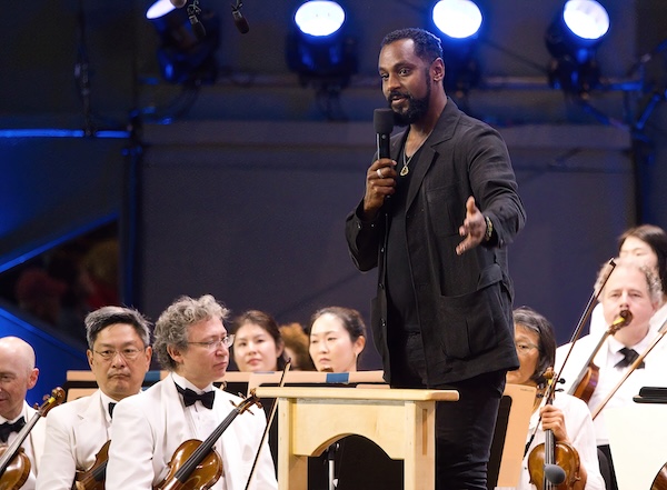 Carlos Simon onstage at the Shed at Tanglewood, introducing his Fate Now Conquers on August 18, 2024. Photo: Hillary Scott, courtesy of the BSO