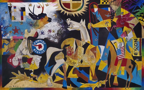 Several Indigenous artists are represented in the exhibit. In Guernica to Wounded Knee, 2012, Stan Natchez presents a twist on Picasso’s famous 1937 painting, which illustrates the horrors of the Spanish Civil War. Natchez, a member of the Shoshone-Tataviam tribe, focuses on the Wounded Knee Massacre of 1890, in which the U.S. Army killed hundreds of Lakota people, mostly women and children.
