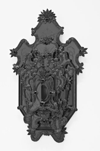 In Iago’s Mirror, 2009, Fred Wilson uses glass to produce an elaborate black mirror that reflects the story of Shakespeare’s Othello. The tragedy revolves around the conflict between Othello, a general of African or Arab descent, and his trusted friend Iago. When Othello passes over Iago for a promotion, Iago seeks revenge by planting doubt in Othello’s mind about his wife’s fidelity. Iago uses racial insults to suggest that Othello’s skin color makes him inferior. In Wilson’s work of art, the mirror is black, not the usual reflective silver, insinuating that lies about people of color have obscured our history.