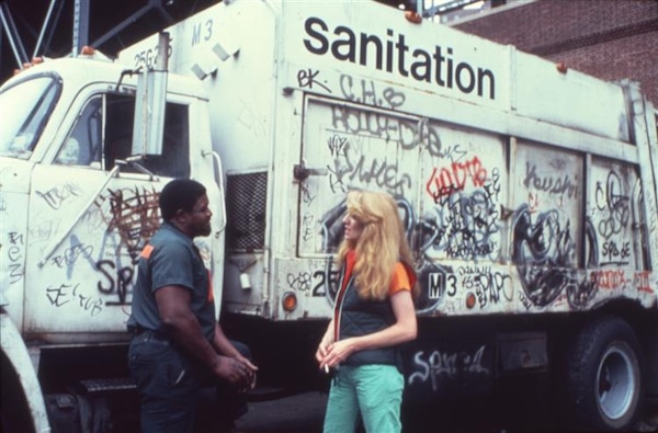 Quixotic is an understatement for how the artist, Mierle Laderman Ukeles, was viewed when she showed up at the Sanitation Department in the ’70s and declared that she wanted to meet employees who drove garbage trucks and collected trash throughout the city. In footage from the time, when the city’s financial crisis forced massive layoffs, she was met with incredulity by the sanitation workers she met. Both parties agreed on one thing: the garbagemen were essential and underappreciated. Ukeles became the department’s unsalaried Artist in Residence. There were already plenty of graffiti artists “working on” the big white trucks for free.