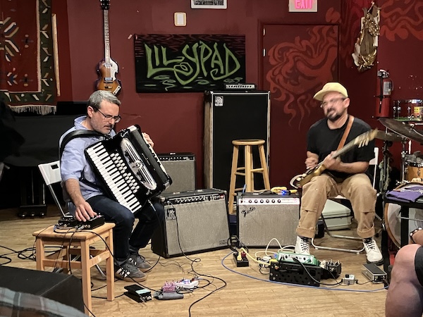 At the Lilypad, as part of the Point01 Percent residency program, the two faced each other across the stage — Mantilla bespectacled and bearded, in a tan ball cap, black T-shirt, tan pants, and high lace-up white boots; Reichman, with mustache and glasses, in blue collared shirt and jeans. Mantilla began by emitting scratched-out and squeezed-out sounds that barked and yelped, urged on by his body English — pivoting and bending at the waist while his feet worked pedals and oscillating electronics filled the air, created by Reichman’s kit of pedals and a black box on the table next to him.