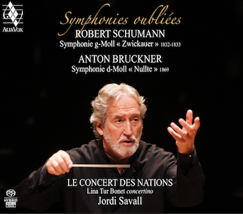 Robert Schumann’s early G-minor Symphony, which fills out the album, is similarly abrupt and sketchy, though parts of it point to the later 19th century (its Adagio introduction periodically suggests what Bruckner, in his numbered symphonic installments, would do). Here, Savall and his band are on firmer footing — Schumann doesn’t always require the warm, Romantic tone Bruckner does — and their take on this “Zwickauer” Symphony’s tempestuous Andantino is well directed and clean.