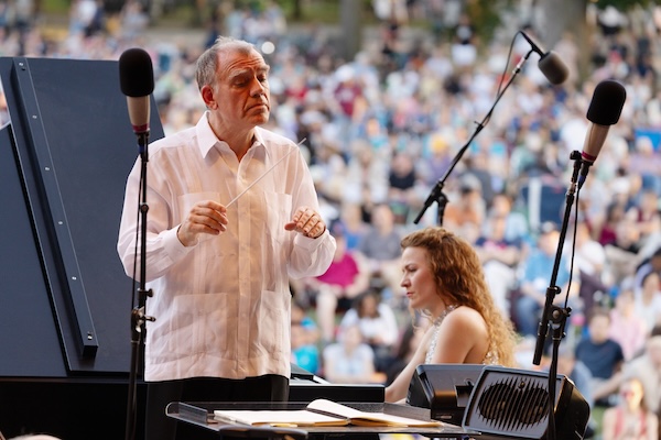 Christopher Wilkins conducting the Boston Landmarks Orchestra and pianist Asiya Korepanova in a performance of Amy Beach’s Piano Concerto in C-sharp minor. Photo: Michael Dwyer