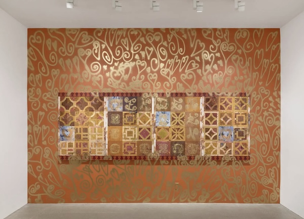 But, on closer inspection, elements broke through and overwhelmed the grid: cascades of ornamentation, paint, gold leaf, quilting, collages, and photo transfers, the latter conveying social and political commentary.