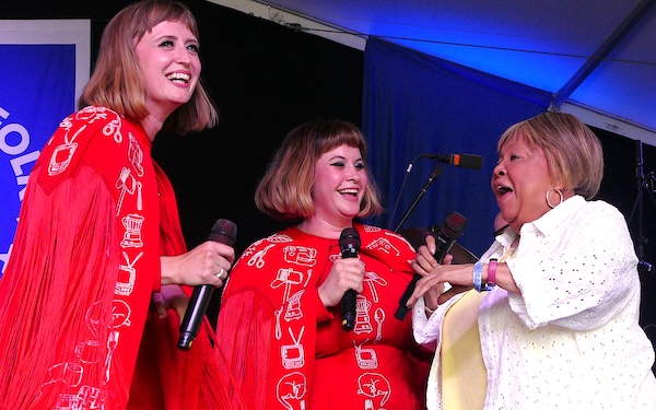 Holly Laessig and Jess Wolfe of Lucius with Mavis Staples at Newport Folk. Photo: Paul Robicheau