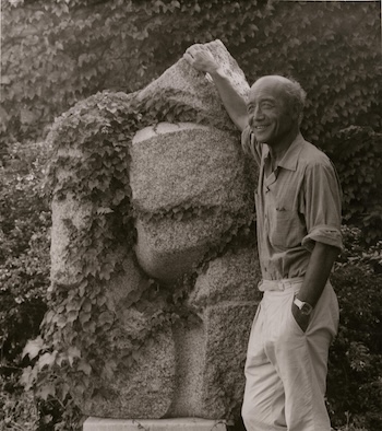 Isamu Noguchi with Indian Dancer (1965–66) in Long Island City, NY, 1981. Photo: David Finn. The Noguchi Museum Archives, 04378.