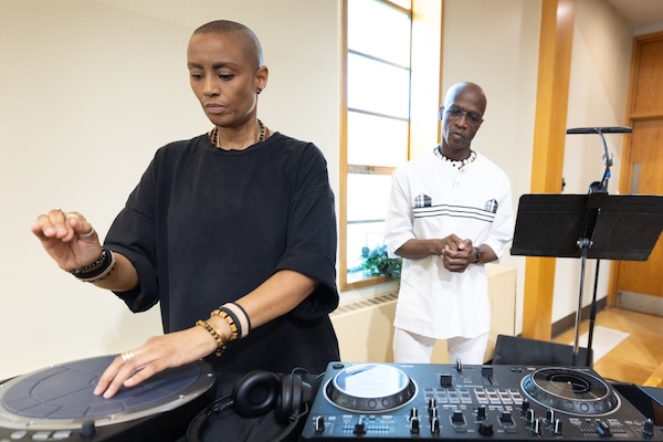 “Sound chemist” Val Jeanty and  Jean Dany Joachim performing with the Boston Landmarks Orchestra in Roxbury. Photo: Michael Dwyer