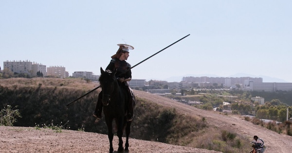 Now we come to one of the most famous dreamers of all, Don Quixote, who in Gaspard Hirschi’s uneven but at times inspired I am Night at Noonday (2025; screens September 12 at 3:45 p.m. at the Strand Theatre). The figure is more Brechtian perhaps than quixotic here, more of a triste figura than the warbling picaro of the stage and movie production. Portrayed by suitably gaunt theater director, Manolo Bez, he wears the traditional DIY armor of cast-off welding mask, colander, and the like. He also bears a formidable-looking lance and rides a striking black charger. His Sancho Panza is a roly-poly pizza delivery guy on a moped; they meet in one of the film’s more amusing moments as the soon-to-be Sancho, demanding payment for his pizza, chases the circling knight on horseback.