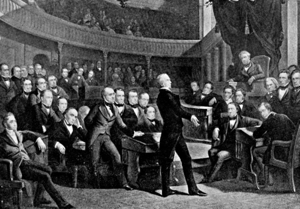 A 1900 illustration depicts the US Senate in 1850, as Senator Henry Clay delivers a speech. Seated in the second row behind him is Daniel Webster, and on the far right is John Calhoun. Photo: Wikimedia Commons