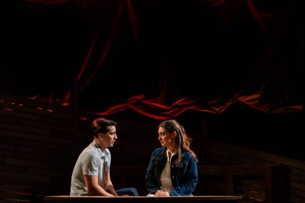 O’Connor and her team can’t resist the urge to bring some traditional theatrical elements to their Our Town. Scenic designer Shelley Barish has set up a stylistic wooden circle on the stage, with a ramped curve upstage and movable platforms that turn into tables and benches for all the many locations that are needed. A fenced back wall frames the stage, with a fabric backdrop upstage, crumpled at the horizon, which, when lit, resembles clouds.