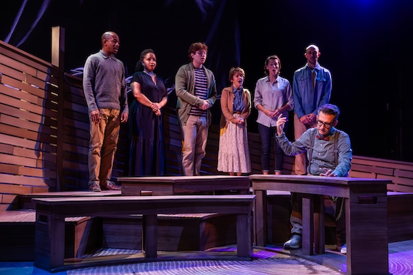 (l to r) Darren Paul, Thomika Marie Bridwell, Jacob Thomas Less, Kathy St. George, Amanda Collins, Jesse Garlick, and John Kuntz in the Lyric Stage production of Our Town. Photo: Nile Hawver