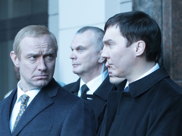 We learn all this when a journalist (Jeffrey Wright) visits the retired Baronov’s luxurious dacha outside Moscow and learns how the right soothsayer helped a man without charisma become a leader called the Tsar. The dour Putin, at least as played by Law, doesn’t need much charm; nor does Baronov once his status becomes impregnable. At one point, TV broadcasters ridicule Putin on a popular satirical puppet show (soon taken off the air). Baronov tells one of the show’s producers that “it’s up to the prime minister to determine the lines between satire and insult, especially during election season. The prime minister has determined a line that must not be crossed.”