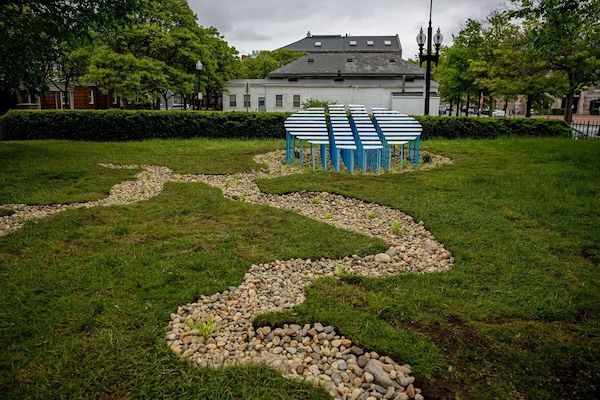 On the other hand, some of the wonderful Triennial pieces included This Moment for Joy by Boston artist Alison Croney Moses, a graceful undulating wall of wooden slats on a gradient curve representing the loving warm embrace and inspiration of important Black women in the artist’s life. Set at the Charlestown Navy Yard, Moses’s piece demonstrates how a minimalist approach to skillful woodcraft could create public art that evokes the warmth of a sanctuary in form and scale. Also at the Charlestown Navy Yard, Evelyn Rydz served up a splendid environmental installation, Convergence: Porous Futures. Created from an elegant grid of mirrors set on low posts — modeled on abstracted storm drain — the piece sat above winding lines of stones cut into the lawn, which depicts the confluence of the nearby Mystic and Charles Rivers. Like most of Rydz’s art, this work focuses on water infrastructure and its environmental impact in the context of increasing weather extremes.