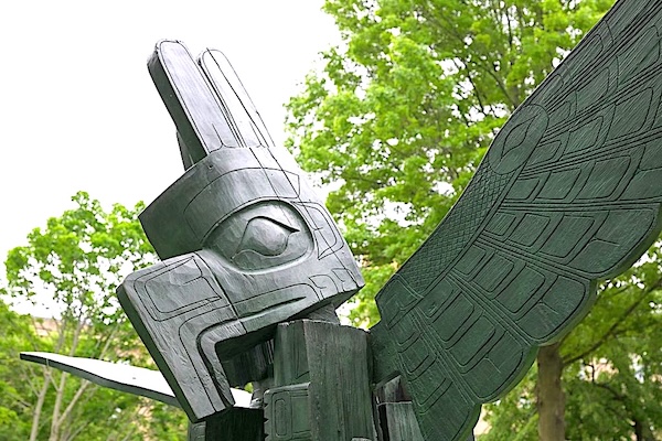 Located at Evan’s Way Park in front of the Isabella Stewart Gardner Museum, Alaskan artist Nicholas Galanin’s I think it goes like this (pick yourself up) references his Northwestern Indigenous heritage through a totem with thunderbird atop a decomposing robotic body. On the ground, imitation totem pieces and sections surround the kneeling form. The point is clear: this is a dramatization of the damage to Indigenous culture by colonization, particularly the difficulty of repairing the enormous harm done by outside interference and attempts at cultural homogenization.