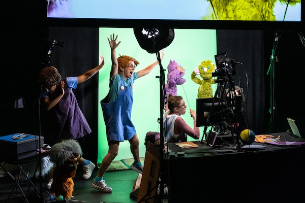 The company also brings in a Narrator (a talented Lily Emerson) to make sure that even the youngest audience members are able to follow the story. Emerson also draws on the tried-and-true technique of periodically asking audience members direct questions, and she waits for their resounding answers. At one choice point, she asks the audience what Leonardo should do, and the audience –– both parents and children –– enthusiastically shout out a range of possibilities. Key to the production are the puppeteers: Kevin Michael Wesson (Leonardo), Sharina Latrice Turnage (Kerry), and Karley Gesine Bergmann (Sam). Choreography is by Sarah Fornace, and music, lyrics and sound are by Ben Kauffman and Kyle Vegter. Storyboards and 2D puppet designs are by Drew Dir, costumes and wigs by Mieka Van der Ploeg, lighting by Try Brazeal and Nick Chamernik, and hand and rod puppets by Lizi Breit.