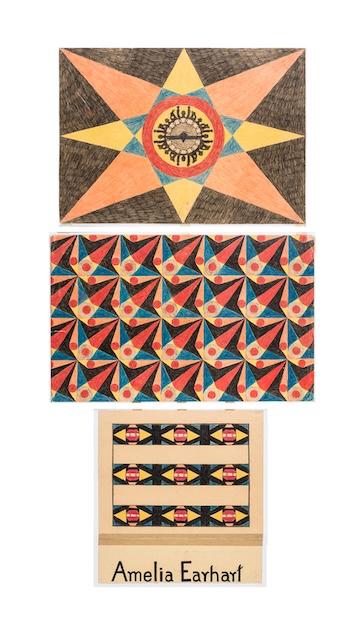 Mary Sully (1896-1963), a Dakota Sioux, is represented by nine of her “personality prints,” geometric triptychs of famous people made with colored pencil, graphite, and watercolor. In a portrait of Amelia Earhart, Sully fills the upper third with images of the single-engine propeller surrounded by silhouettes; the middle section features a series of spotlights, and the lower third contains an array of diamond shapes, similar to the patterns that Plains women added to rawhide containers. Sully worked in near obscurity and without patronage; her extraordinary work has only been exhibited in recent years.
