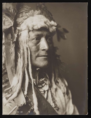 Edward Curtis, White Duck, a Hidatsa Indian wearing a headdress, taken c. 1908.