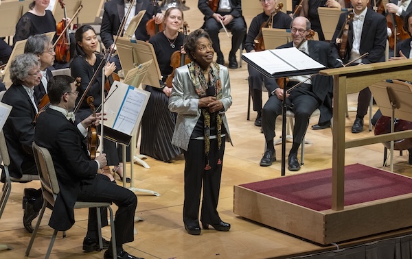Composer Tania León introduces Time to Time onstage at Symphony Hall on Thursday November 13. Photo: Michael J. Lutch, courtesy of the Boston Symphony Orchestra