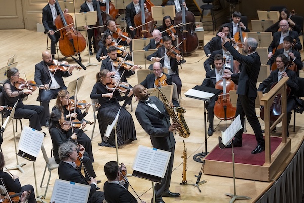 James Carter at Symphony Hall, playing Roberto Sierra’s Concerto for Saxophones on Thursday November 13, with Dima Slobodeniouk conducting. Photo: Michael J. Lutch, courtesy of the Boston Symphony Orchestra
