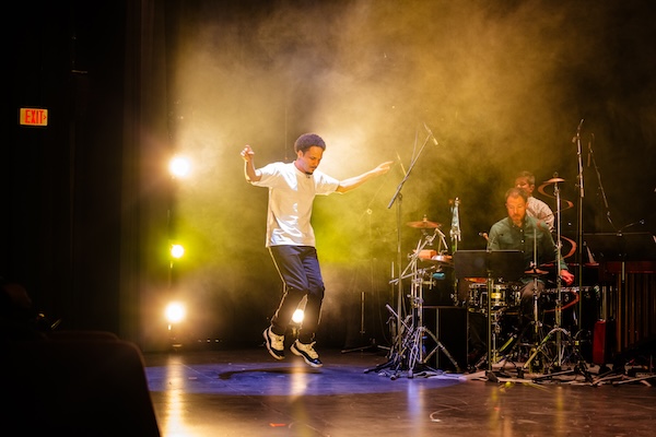 Chicago based Third Coast Percussion’s Metamorphosis, which the Celebrity Series brought to the lovely and still relatively new refurbished space of Arrow Street Arts in Cambridge Nov 22-23,  juxtaposes marimba-forward classical and percussion with urban street dance, and uncovers the steady, anticipatory beat that ties them together. With massed marimbas and keyboards making a ledge like a horizon across the middle of the stage space, a small seemingly-carved out dance floor welcomed dancers Trent Jeray and Cameron Murphy  in motion created by Lil Buck and Jon Boogz of Movement Art Is.
