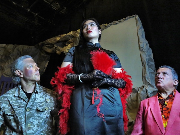 (l) Joseph Patrick Marshall as Sal B. (c) Napaht Na Nongkhai as Mme. Chang (r) George Lugo as Sy in the Great America Play Series staging of The Story of Sal B. and Barbranne: A Mob Fantasia (Cyrano Redux). Photo: Jonathan Slaff.
