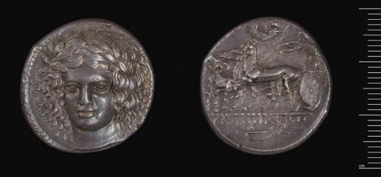 Tetradrachm of Katane signed by Herakleidas, Greek, 406–405 BCE. Silver. Harvard Art Museums/Arthur M. Sackler Museum, Bequest of Frederick M. Watkins, 1972.134.