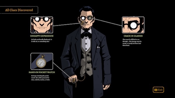 Time is in short supply to solve the mystery before the Grand Séance takes place on All Hallow’s Eve. Minutes elapse each time you interact with a new object or line of dialogue in the game: rifling through belongings, asking manor staff and guests questions—even breaking into rooms to do some snooping—all cost valuable time. The first two mysteries of the game must be solved within the time limit of an hour — on threat of eviction from the manor (meaning game over for the player). To my initial chagrin, this meant forgoing my usual mystery game logic — of leaving no stone unturned — in favor of strategic sleuthing.