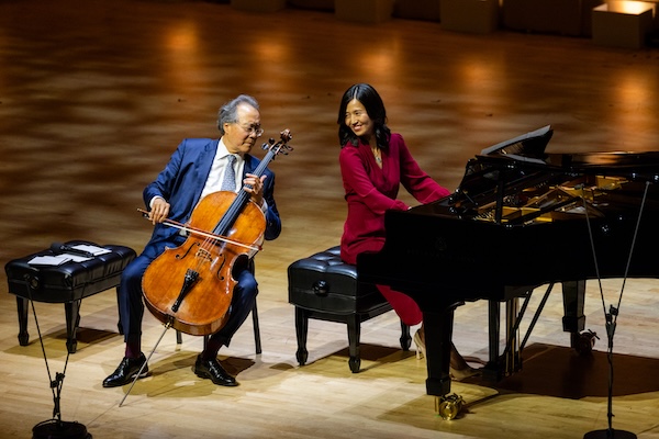 Cellist Yo-Yo Ma and Boston Mayor Michelle Wu performing at Symphony Hall. Photo: Robert Torres