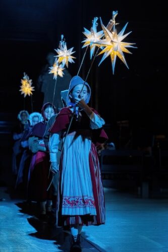 The venerable David Coffin serves as the affable master of ceremonies, warmly welcoming audiences to the celebration. After this, the large cast of musicians, community singers, and a few professionals — nearly 70 performers in all — fill the stage with a delightful opening song and dance, “Nu Är Det Jul Igen” (“Now It Is Christmas Again”), a traditional Scandinavian folk song.