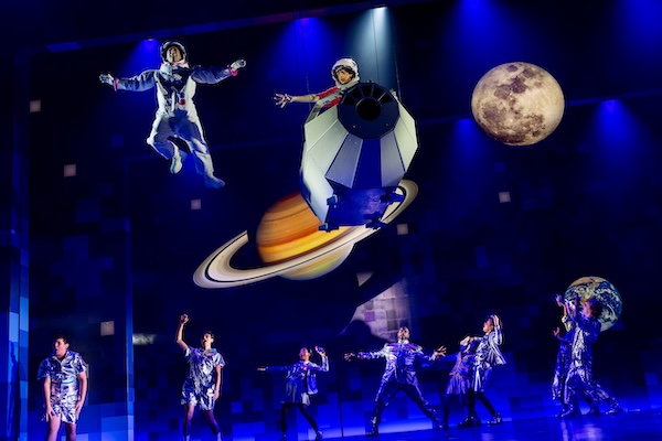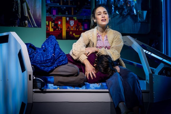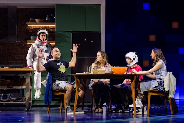 The scenic and lighting designs (by Matt Saunders and Bradley King, respectively) are both beautiful and evocative, helping the story move from intimate family scenes to scenes on a much larger scale (even the much, much larger scale of outer space). The lighting includes patterns that can evoke a starry night sky or the pixels of a computer screen (Auggie is a fan of the computer game, Minecraft).