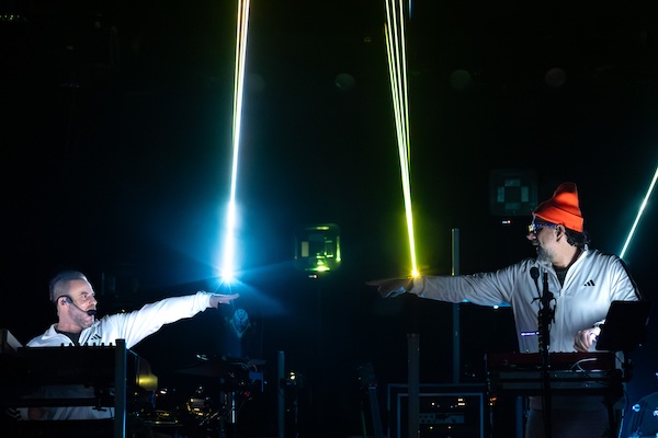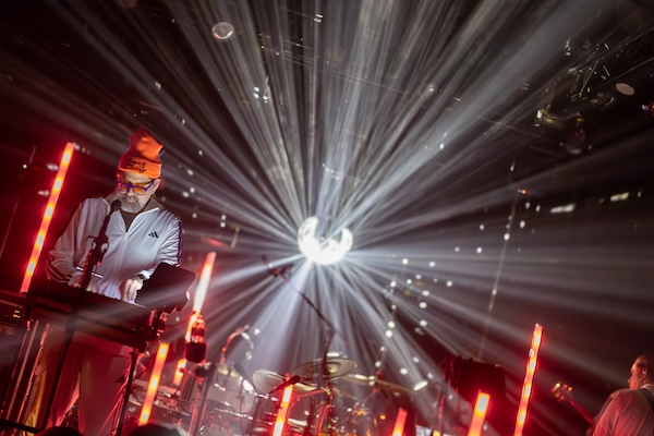 Before the midnight madness of the third set, the night’s middle set truly did the crowd a house party favor befitting New Year’s Eve, stroking dance delirium at the core of the group’s trance-fusion. Cross-planes of white beams bridged “Rivers” before the well-placed “We Like to Party” elevated the club-beat vibe, the Biscuits using the cavernous room to advantage with large-scale laser projections. “Don’t let them tell you all the hype,” Brownstein sang from his keyboard post amid the song’s swirls, builds, and drops while the lasers danced in squiggly shapes across the ceiling and edges of the balcony.