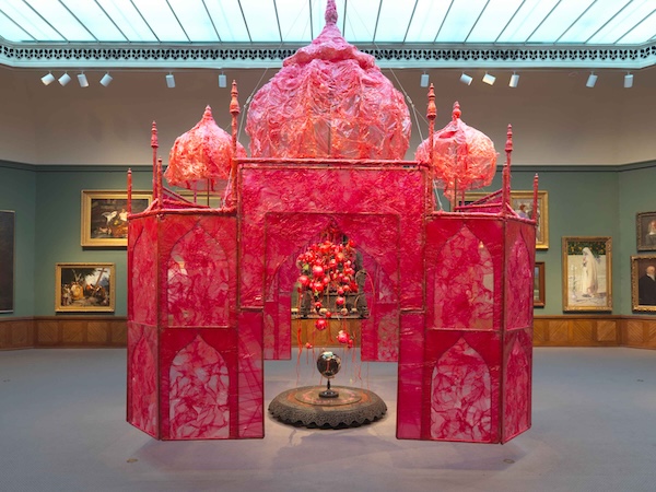 The Yale Center for British Art opens Rina Banerjee: Take me, take me, take me… to the Palace of Love on February 7. Banergee’s point of reference is the Taj Mahal (actually a tomb, not a palace) but in place of white marble inlaid with semi-precious stones, she uses a steel and copper frame wrapped in transparent pink cellophane. The construction is suspended over the floor of a vast space containing relics of the British Raj colonialism, including an antique Anglo-Indian chair and a chandelier composed of pink foam balls, plastic beads, other synthetic materials, and fake birds.