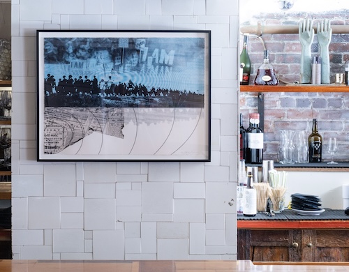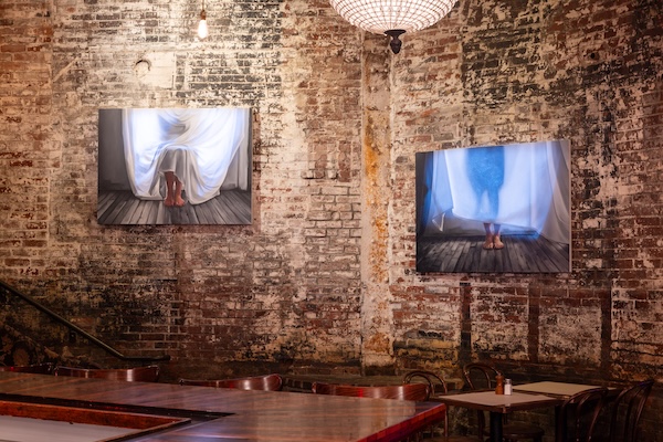 The Beehive is a popular South End restaurant known for live music. Because the restaurant doesn’t have a dedicated gallery space, Hauck has adapted much of the available wall area for the exhibit. While the pieces have a label identifying the artist, title, and sale price, there are no descriptive captions to supply context. A booklet is available upon request: it contains images of the artwork, along with a QR code that leads you to Hauck’s website, Misstropolis.com, which provides valuable information about the artists and their creative processes.