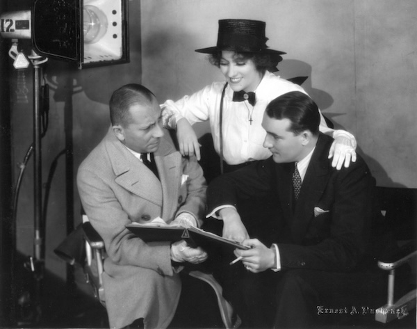 Erich von Stroheim, Walter Byron, and Gloria Swanson discussing a scene in Queen Kelly. Photo: IMDB
