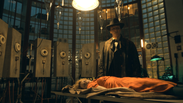 The fresh corpse, in the form of Jessie Buckley, is laid out on the lab table. In an earlier scene we learned that the woman is Ida, a party girl who was murdered because of the secrets she held about certain wealthy men. This scenario will later return via a film noir subplot. “She’s too beautiful,” says Frank as we hear a sinister maid knock curiously at the lab door. Jeanie Berlin makes her cameo as the doctor’s assistant, a role previously played in the ’30s by Dwight Fry. Shooing her away, Dr. Euphronious turns to Frank and explains that she has neither the time nor the inclination to hunt for another, less attractive, corpse